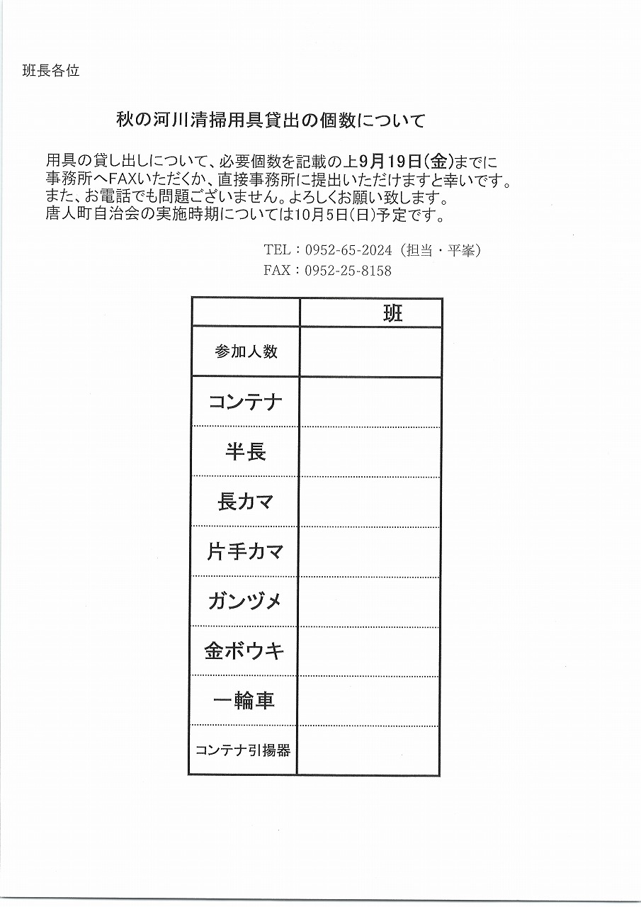 秋の河川清掃用具貸出の個数について